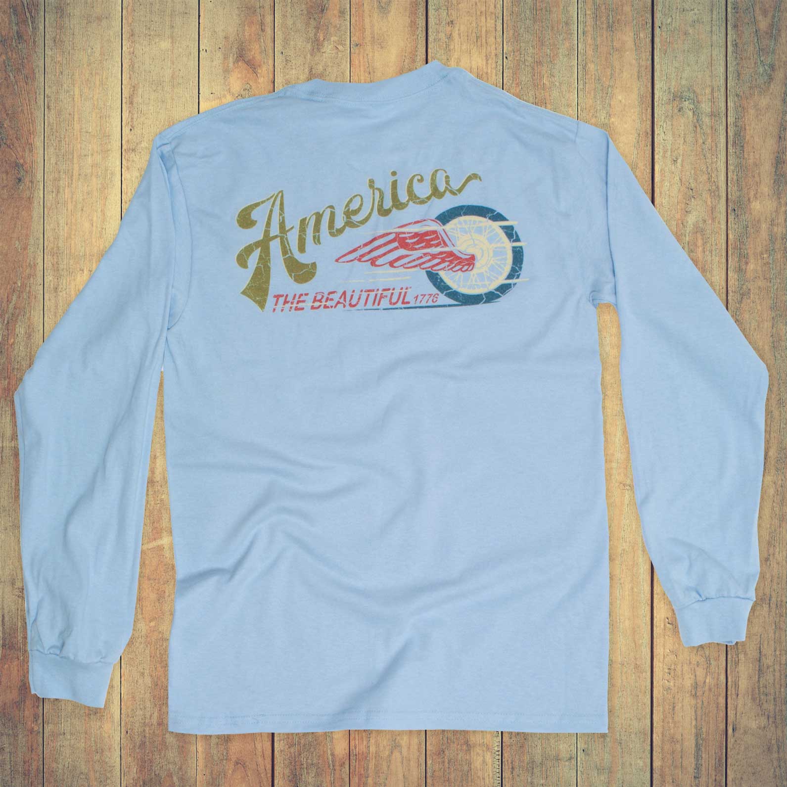 Surf Washed® Retro Motorcycle Winged Wheel Cotton Graphic Crew Shirt - Long Sleeve: Light Blue L
