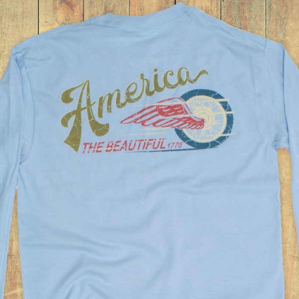 Surf Washed® Retro Motorcycle Winged Wheel Cotton Graphic Crew Shirt - Long Sleeve: Light Blue S