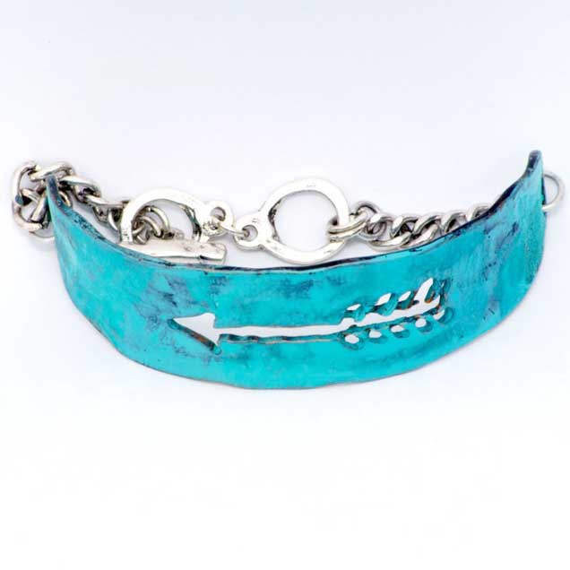 Silver colored knotted band with antique gold arrow head and feathers. Fashion jewelry.